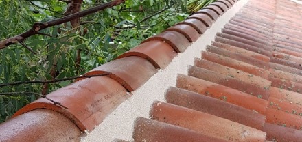Réfection des scellés au mortier pour renforcer la solidité des tuiles faîtières.